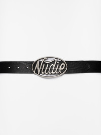 A belt crafted from 40 mm wide vegetable-tanned black, full-grain leather. The antique brass finish metal buckle is molded in the shape of the word Nudie. This belt showcases quality craftsmanship, intricate detail, and exceptional aging properties. Details - Vegetable-tanned full-grain leather - Width 40 mm - Antique brass finish metal buckle - Size is in centimeters and measured from the buckle pin to the middle hole. 100% Leather Made in PL A belt crafted from 40 mm wide vegetable-tanned black, full-grain leather. The antique brass finish metal buckle is molded in the shape of the word Nudie. This belt showcases quality craftsmanship, intricate detail, and exceptional aging properties.