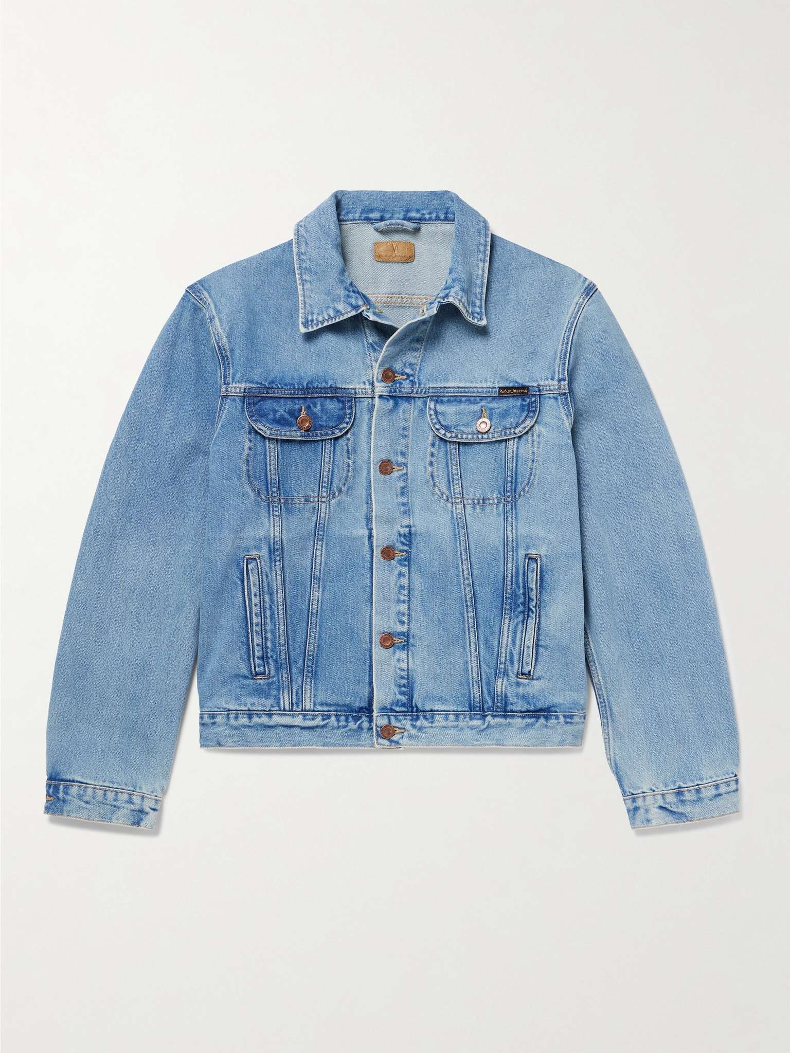 Nudie Jeans' trucker jacket is cut from denim that's woven from organic cotton and washed to enhance its handle. The fabric is soft to the touch with uneven slubs, creating a rich texture throughout. Bronze hardware rounds out the classic design. Lower Impact Materials. This product is made using at least 50% lower-impact materials or ingredients. Find out more about our Consciously Crafted criteria here. Size & Fit - Fits true to size. Take your normal size - Designed for a slightly loose fit - Mid-weight, non-stretchy fabric - Model is shown wearing a M - Model measures: chest 38"/ 96cm, height 6'3"/ 191cm Details & Care - Light-blue organic denim - Button fastenings - 100% organic cotton - Machine wash