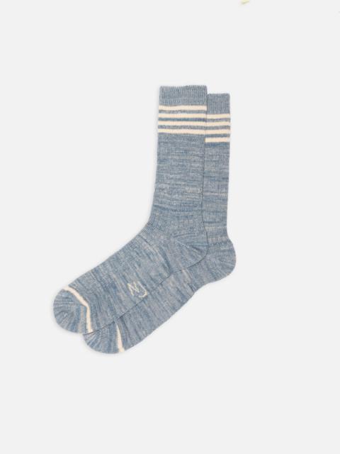 Treat your feet to these handsome socks in soft midweight 3x1 rib knit made with a mix of blue and offwhite yarns. The cotton is organic. It features a striped leg and toe and an intarsia knit logo on the sole. Details - Organic Cotton - Midweight knit - Intarsia knit logo on the sole - One Size (EU 41-45) 88% Cotton 11% Polyamide 1% Elastane Made in PT Treat your feet to these handsome socks in soft midweight 3x1 rib knit made with a mix of blue and offwhite yarns. The cotton is organic. It features a striped leg and toe and an intarsia knit logo on the sole.