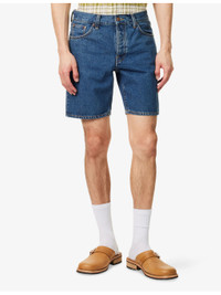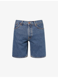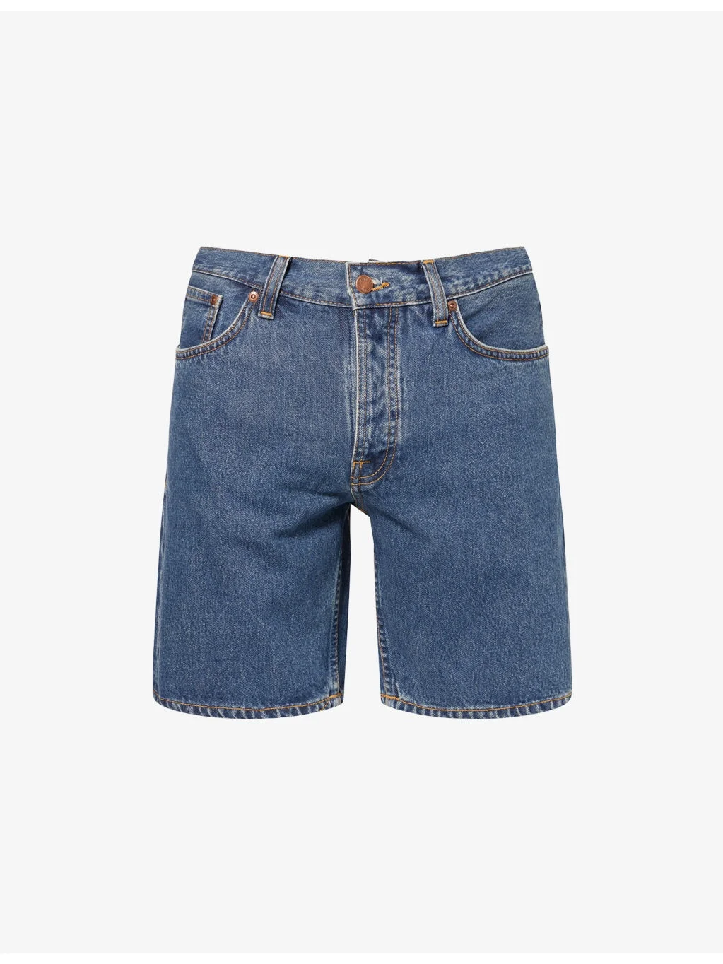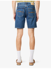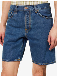 PRODUCT DETAILS - Nudie Jeans denim shorts - 100% cotton - Button and zip-fly fastening at front - Regular fit, high rise, five pockets, brand patch at back, all-over contrast top stitching, all-over washed effect - Machine wash at 40°C - Made in Tunisia - Size UK 30: rise 10.6in / 27cm, leg length 8.2in / 21cm, leg opening 21.2in / 54cm - Model is 6ft 2in/1.88m and wears a size UK 30 - Midweight, non-stretch Ref: R04454609