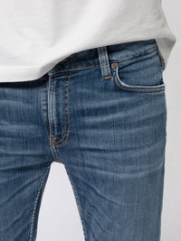 Jeans with a low waist and tight fit made in organic super stretch denim. The super stretch denim makes the jeans fit tightly and comfortably all over. To ensure a tight fit around the waist and particularly at the lower back, Skinny Lin features a curved waistband. Size & Fit Model is wearing size: W30" L30" Model's height: 184 cm / 6’0.5” Details - Organic Cotton - 12.5 oz. super stretch denim - Orange threads on all seams - Copper trims - Zip fly - Jacron patch - Tight fit - Low curved waist - Tight Leg - Tight leg opening 92% Cotton 6% Polyester 2% Elastane Made in TN Jeans made in 12.5 oz super stretch denim that has been washed to a mid blue shade of indigo. The brighter moustaches and the orange thread contrasts beautifully to the base tone, while the navy back pocket embroidery adds a level of simplicity. A clean yet authentic Skinny Lin in effortlessly comfortable denim fabric.