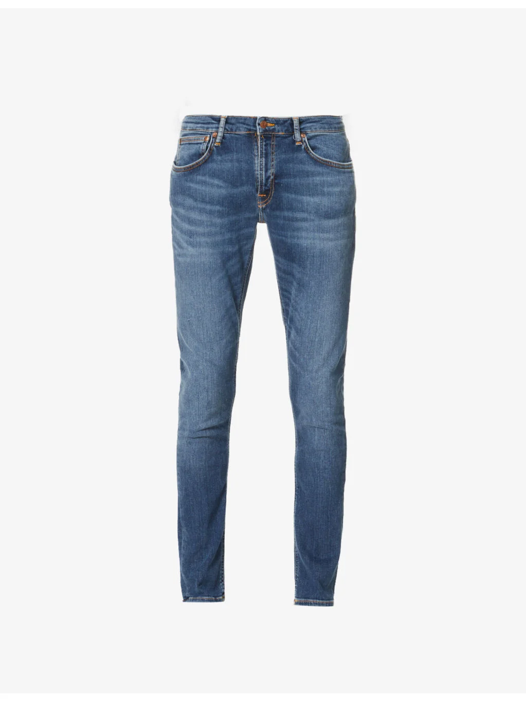 PRODUCT DETAILS - Nudie Jeans stretch-denim jeans - 92% cotton, 6% polyester, 2% elastane - Exposed button and concealed zip-fly fastenings at front - Low rise, tapered, belt loops, five pockets, branded hardware, faded wash and whiskering, branded leather patch at back waistband, V-shaped yoke at back - Machine wash cold - Size UK 32: rise 9in / 23cm, inside leg 31in / 78.5cm, leg opening 10in / 26cm - Model is 6ft 2in/1.88m and wears a size UK 32 - Midweight, slight stretch Ref: R00039443