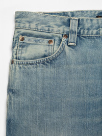 Our classic fit Slim Jim is back in a limited edition. Slim Jim jeans in Summer Dirt wash with textural slubs. Made from 13.7 oz rigid organic cotton denim. Features off-white stitching, slim fit, and slight bootcut. Details - Organic cotton - 13.7 oz. rigid denim - Off white thread at seams - Copper trims - Zip fly - Jacron patch - Slim fit - Mid waist - Slim leg - Slight bootcut 100% Cotton Made in TN The Nudie Jeans classic, Slim Jim—a slim fit jean with a slight bootcut is back. The Summer Dirt wash, crafted from streaky denim, features a striking texture with pronounced vertical slubs of varying length and thickness. This slubby texture is beautifully complemented by a subtle crosshatch pattern, adding depth and dimension to the denim's rich surface. The expertly crafted wash enhances these textures, bringing out the lows for added depth, while the warmly tinted highlights add brightness and a smoother, more vertically streaked appearance. The sun-bleached, dulled tone amplifies the vintage vibe, and the off-white thread color pays homage to one of the earliest Slim Jim styles. Slim Jim Summer Dirt is our vivid past brought back to life.