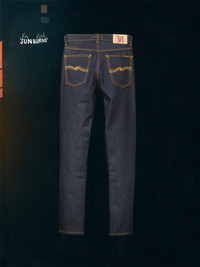 Details - Organic cotton - 13 oz. stretch denim - Orange thread at seams - Sunburns gradient back pocket embroidery - Copper trims - Jacron patch - Slim Fit - Mid Waist - Straight Leg - Slim Leg Opening Solid Ollie Dry Sunburns stands out with its gradient back pocket embroidery, shifting from deep orange to pale yellow, with our own Nudie Jeans Orange at the center. Paired with a special graphic Jacron patch, it subtly plays with our identity and iconography. Underneath it all is a 13 oz denim, dyed with an indigo top over a sulfur-dyed bottom, creating a deep, almost inky tone that holds its intensity even as it fades. This fabric doesn’t just age—it evolves, setting the stage for wear that reveals stark contrasts and layers of character. Its rigid-like texture, with a balance of yarn slub and salt-and-pepper grain, carries an undeniable rawness. The clear twill lines cut through the texture, adding structure, while the stretch gives just enough comfort without ever dulling the ruggedness. A long-time favorite of ours, this denim delivers a level of character unlike any other stretch fabric. It’s built for the long haul, destined to become tomorrow’s vintage.