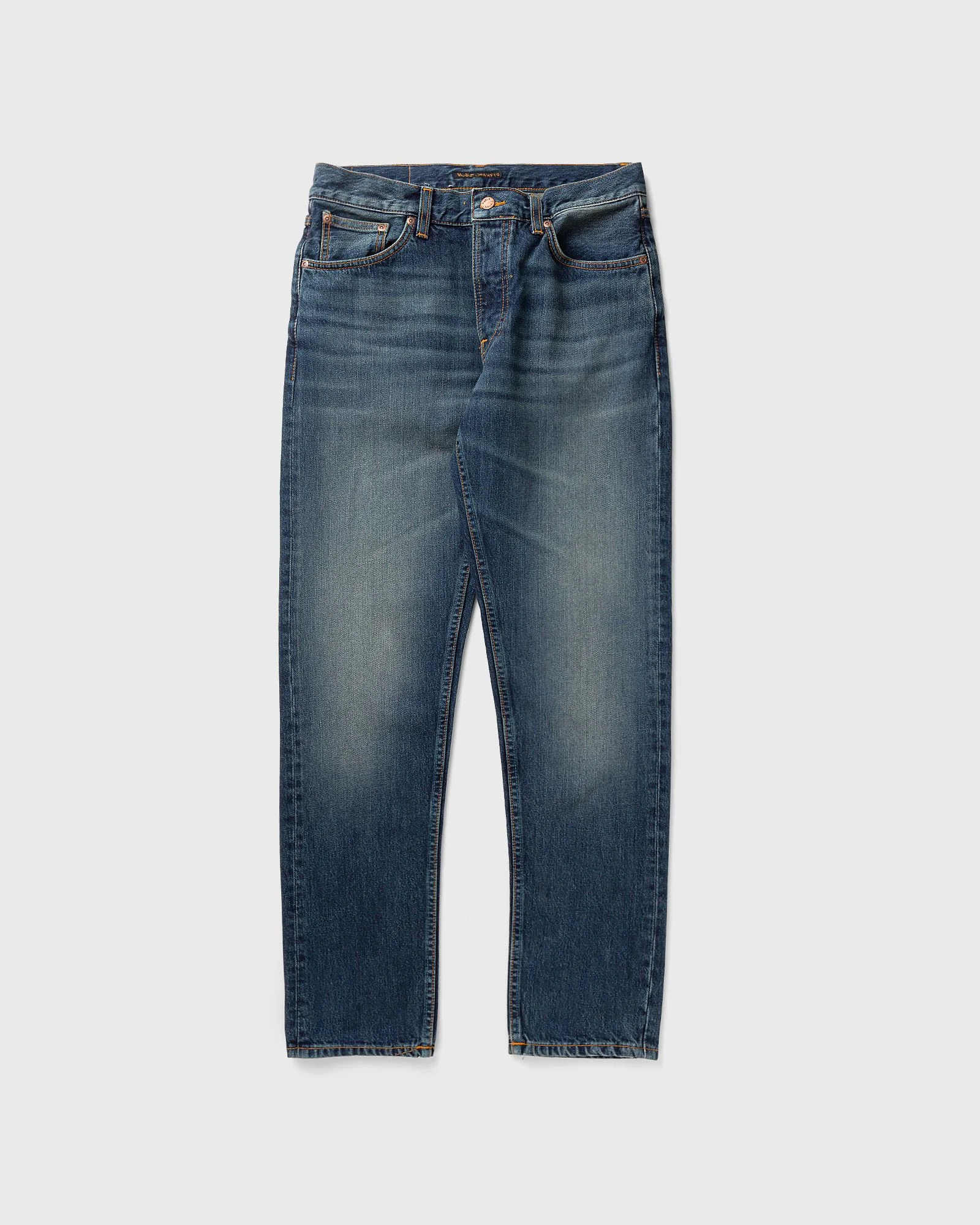 The Steady Eddie II jeans from Nudie Jeans are regular-fit jeans with a tapered leg in a striking Sand Storm wash. The medium-dark base is contrasted by bold highlights and a greenish-gray shimmer, creating a stormy, worn vintage look. Vertical slub texture and subtle marbling effects emphasize the texture of the denim and add depth and character. - Regenerative organic cotton - 14.2 oz. solid denim - Orange stitching - Copper-colored embellishments - Button fly - Jacron patch - Regular fit - Mid-rise waist - Tapered leg Article number: 115053 Gender: men Color: SAND STORM Material: 98% Cotton, 2% Spandex/elastane