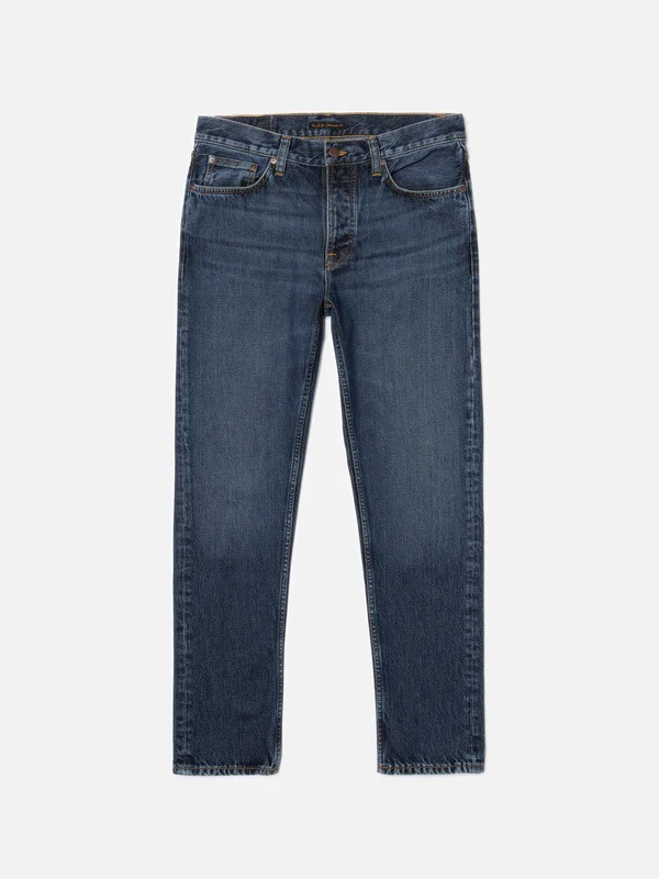 Regular-fit jeans with a tapered leg made in a dark blue wash with subtle wear. Made from organic cotton. Size & Fit Model is wearing size: W30''L30'' Model's height: 186 cm / 6'1'' Details - Organic cotton - 14.9 oz. rigid denim - Tobacco thread at seams - Navy back pocket embroidery - Copper trims - Button fly - Jacron patch - Regular fit - Mid waist - Tapered leg - Slim leg opening 100% Cotton Made in TN Regular-fit jeans with a tapered leg made in a dark blue wash with subtle wear. Although dark, these jeans got it all. They span an impressive array of indigo hues - from the darkest of the dark to muted bright blue highlights. Abraded areas add softness while the unabraded ones add a rugged marble texture.