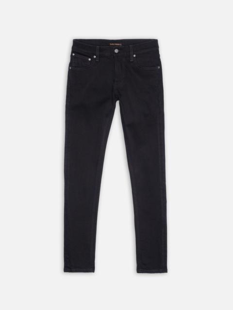 Jeans with a low waist and tight fit made in our organic power stretch Everblack denim. Black denim that stays black. Size & Fit Model is wearing size: W30" L30" Model's height: 184 cm / 6’0.5” Details - Organic cotton - 12 oz. power stretch denim - Black threads on all seams - Antique silver trims - Zip fly - Jacron or leather patch - Tight fit - Low waist - Tight Leg - Tight leg opening 99% Cotton 1% Elastane Made in TN Pitch black jeans made in power stretch denim that stays black. Our Everblack fabric is made to maintain its color for as long as possible, withstanding 40, or more washes without any significant loss of color. To optimize the denim for the fit, these jeans have been rinsed, making the jeans stretchy and soft. If you are looking for a pair of pitch-black jeans that do not fade this is the way to go. Keen on knowing what differentiates Everblack from other black denim? Normally, when denim is dyed part of the dye will absorb in the cotton fibers while the rest remains bound only to the surface of the yarns. This is what gives denim its aging property that in many cases is sought after. However, when it comes to black jeans this is not always the case which is why we developed the Everblack denim. The technical difference between Everblack and regular black denim is that it utilizes a method and type of dyestuff that allows improved absorption as well as a stronger fixation. This results in denim with a significantly greater colorfastness, which does not fade with wearing and washing. Since April 2018 we shifted our production into using the paper-based material jacron for our waistband patches. Now all our denim products are produced using the jacron patch. However, a number of our products will have stock of both jacron and leather for some time. This product is one of those and comes with a patch in either jacron or leather. Both do, of course, hold a high quality and are visually very similar.