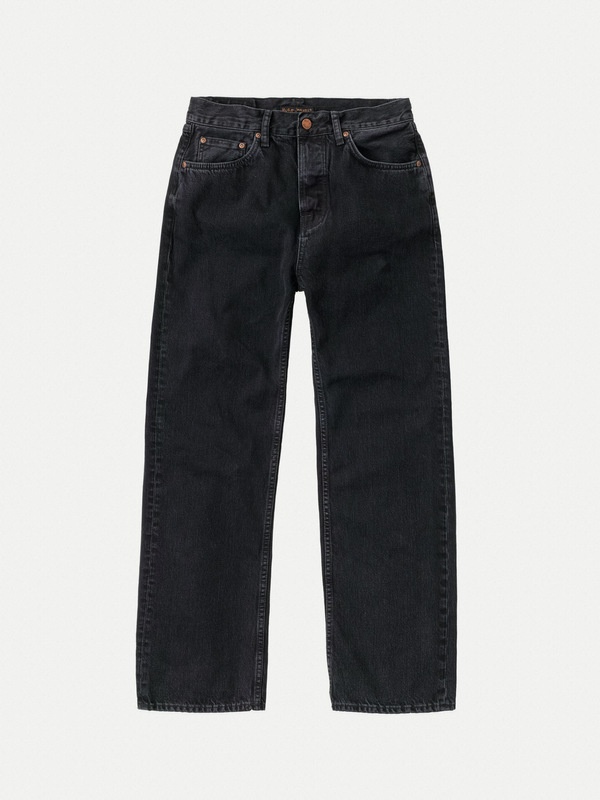 A straight-leg loose fit in a rigid black denim option with smooth stonewash. Made with organic cotton. Size & Fit Model is wearing size: W31" L32" Model's height: 187cm / 6’1” Details - Organic cotton - 12.5 oz. rigid denim - Black thread at all seams - Copper trims - Button fly - Jacron patch - Loose fit - High waist - Wide leg - Wide leg opening 100% Cotton Made in TN Loose-fit jeans with a straight leg made in our favorite Italian black denim. These jeans have been treated with a smooth stonewash that has revealed a muted yet rich marbling texture. Over the seams, wash effects are more pronounced, giving the jeans a beautiful depth. Dull black with muted contrast, stonewashed black denim does not get better than this.