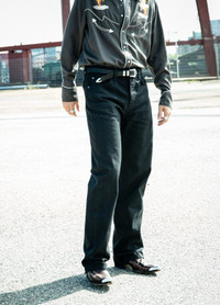 Details - Organic and recycled cotton - 14 oz. rigid denim - Black thread at seams - Antique silver trims - Button fly - Jacron patch - Loose fit - High waist - Wide leg - Wide leg opening These wide-legged, loose-fit jeans come in a deep pitch-black hue, treated with a simple rinse wash. This minimal wash enhances the denim’s texture, giving it a slightly muted black tone while softening the fabric. Crafted from yarn-dyed fibers in both warp and weft, the denim retains undyed yarn cores, allowing it to age much like classic indigo denim. Striking from day one, these jeans are designed to evolve—gradually fading into brighter, monochrome, texturally rich vintage masterpieces. With every wear and wash, they undergo a slow, graceful transformation. Simply put, they offer both instant appeal and the promise of tomorrow’s vintage.