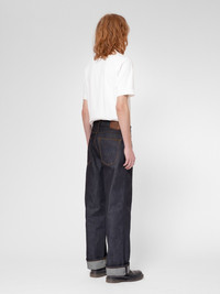 Jeans made in a 14.2 oz. Japanese selvage denim with an aging property that is simply ace. Details - Organic cotton - 14.2 oz. Rigid Japanese selvage denim - Tobacco thread at seams - Antique silver trims - Button fly - Jacron patch - Loose fit - High waist - Wide leg - Wide leg opening 100% Cotton Made in IT We are thrilled to introduce our wide-leg, loose-fit, Tuff Tony in the extraordinary Dry Ace Selvage. This remarkable fabric, weighing 14.2 oz showcase a rustic texture and a deep, redcast indigo hue, is a true masterpiece. Crafted by the renowned Shinya Mills in Okayama, Japan, it exemplifies the art of perfecting selvage denim imperfections. The story behind Dry Ace Selvage is as fascinating as the fabric itself. It all began with a vintage, unbranded pair of jeans believed to date back to the 1950s, discovered in a thrift store somewhere in the USA. These jeans displayed wear and significant fading, and most importantly an incredible texture. They made their way to Japan, where denim from the jeans was meticulously reverse-engineered in exhaustive detail. The art of reverse engineering denim is a hallmark of the artisanal Japanese denim industry. Dry Ace Selvage is a remarkable example of this craft, as well as a testament to the unique collaborative approach sometimes employed for premium Japanese denim. The rather extreme slub yarns are spun by Yamachu Mengyo Co. Ltd. in Osaka. The warp yarns undergo an impressive 20 dips in pure indigo dye, resulting in a deeply saturated surface with a notably substantial undyed core, courtesy of Kaihara Co. Ltd. in Hiroshima. Finally, the fabric is masterfully woven under low tension on vintage shuttle looms by Shinya Mills in Okayama. The guiding principle here is – do what you do best – and the final product beautifully reflects the craftsmanship at each stage of the denim's creation. Ace's distinctive character arises from its thick and highly irregular yarns, generous use of indigo, and low-tension weaving. These factors contribute to its appealingly rugged aging property. Over time, the dye rapidly abrades from the surface of the yarns, emphasizing their slub, particularly in the vertical direction. When, or if, the jeans are washed, the yarns slightly rearrange, reducing the vertical slub and transitioning to a rustic crosshatch texture with a coarse salt 'n pepper effect. Notably, the heavily saturated surface of the indigo yarns entails an extraordinary evolution. Washing initially causes the dye to bleed onto the white weft, increasing the depth of color. With successive washes, the indigo gradually fades into brighter brilliant blue hues while deeper tones are preserved at seams and folds. Due to its unparalleled aging property, Ace unquestionably stands as one of the finest Japanese selvage denims we have ever encountered. We are therefore very proud to offer it in Tuff Tony.
