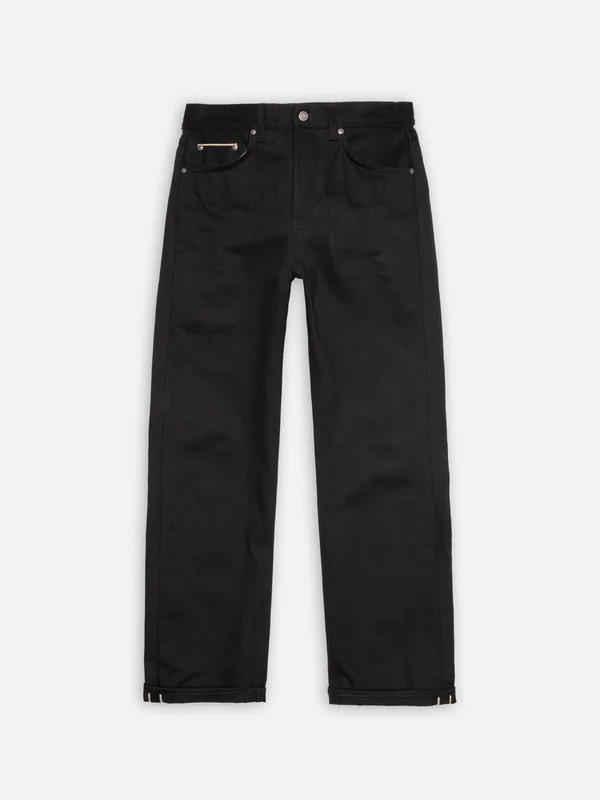 Wide-leg loose-fit jeans crafted from our all-time favorite Japanese black selvage denim. This 14.5 oz. organic selvage denim is a testament to Kurabo Mills' blend of heritage and innovative denim craftsmanship. Size & Fit Model is wearing size: W30" L34" Model's height: 186 cm / 6’1” Details - Organic cotton - 14.5 oz. Japanese rigid selvage denim - Black thread on all seams - Antique silver trims - Button fly - Jacron patch - Loose fit - High waist - Wide leg - Wide leg opening 100% Cotton Made in IT Wide-legged, loose-fit jeans crafted from our all-time favorite Japanese black selvage denim. This 14.5 oz. denim boasts a tight weave density and generous starch application, ensuring remarkable rigidity. But what truly distinguishes it is its exceptional aging property, a testament to Kurabo Mills' blend of heritage and innovative denim craftsmanship. This denim stands out due to its unique construction: the warp, visible predominantly on the fabric's face, is yarn-dyed black, allowing it to gradually fade with wear and washes. Conversely, the weft, visible on predominantly on the fabric's back, is dyed with a 'stay black' dye, retaining its deep black hue without fading. Although this might seem unconventional for fading denim, it yields intriguing contrasts, emphasizing the warp-weft intersections. This clever construction promises more pronounced contrasting fades compared to regular dry black denim. Beyond its unique yarn combination, the denim's tight weave, stiff texture, pronounced twill lines and slightly coarse yarns create an exquisite surface structure and marbling effects with wear and washes. For optimal results, we recommend wearing our dry denim regularly for at least six months before the first wash. While entirely optional, this period encourages striking fades.