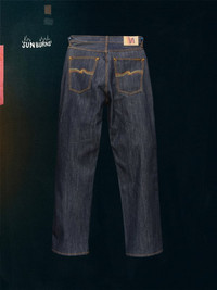 Details - Regenerative Organic cotton - 14.2 oz. rigid denim - Orange thread at seams - Sunburns gradient back pocket embroidery - Copper trims - Jacron patch - Loose fit - High waist - Wide leg - Wide leg opening The Tuff Tony Dry Sunburns stands out with its gradient back pocket embroidery, shifting from deep orange to pale yellow, with our own Nudie Jeans Orange at the center. Paired with a special graphic Jacron patch, it subtly plays with our identity and iconography. Beneath it all lies a proprietary 14.2 oz denim, developed exclusively for Nudie Jeans. Woven with Regenerative Organic Cotton, it revives the raw, textured character of a pair of ‘90s jeans we once stumbled upon. Though undeniably "modern," these jeans are rooted in a transitional era—a time when vintage ring-spun textures resurfaced, and select denim mills strayed from pure efficiency in pursuit of true vintage aesthetics. A defining moment—just before Nudie Jeans was born. The medium-deep pure indigo warp lays the foundation for a break-in journey with options—left raw, it builds stark contrasts; washed early, it fades with a slow, balanced grace. Stiff and substantial, it forms deep creases and sharp wear marks, evolving over time as the warp streakiness fully emerges. The result? A layered interplay of slub, clean twill lines, and subtle marbling—a denim built to become tomorrow’s vintage.