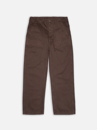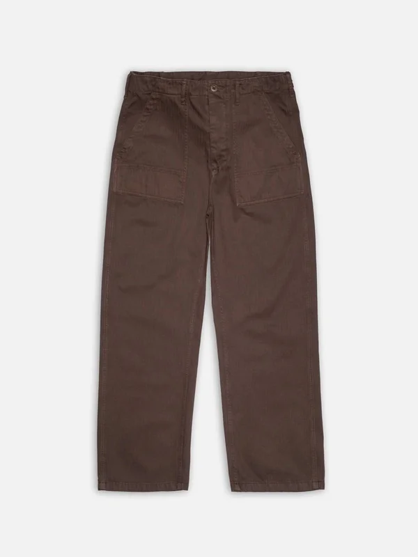 Loose-fit Tuff Tony fatigue pants with patch pockets and an adjustable waistband. Crafted from piece-dyed Walnut herringbone twill with a smooth, slightly crisp texture. Made from organic cotton. Size & Fit Model is wearing size: W30" L30" Details - Organic cotton 100% Cotton Made in TN The loose-fit Tuff Tony fatigue pants offer a neat and spacious design. They feature two patch-on front pockets and two patch-on back pockets with pocket flaps, all reinforced with an additional layer of pocket fabric for added robustness. Equipped with an adjustable waistband, these pants can easily be sized up or worn extra high for a neater silhouette. The main seams are sewn with felled twin-needle seams, providing a clean and sturdy construction.
