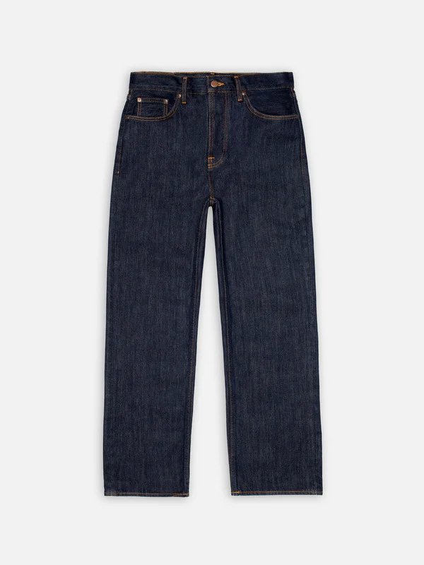 Wide-legged, loose-fit jeans, crafted from regenerative organic cotton in a beautifully simple deep blue wash. The inspiration behind this wash is refreshingly straightforward: a single home wash of dry denim. Crafted from vintage-style deep indigo denim with a medium slub character, the treatment shifts the hue from a dark blue to a rich, redcast blue, while transforming the denim's texture from flat to beautifully irregular and textured. Details - Regenerative organic cotton - 14.2 oz. rigid denim - Orange thread on all seams - Copper trims - Button fly - Jacron patch - Loose fit - High waist - Wide leg - Wide leg opening 100% Cotton Made in TN Wide-legged, loose-fit jeans, crafted from regenerative organic cotton in a beautifully simple deep blue wash. The inspiration behind this wash is refreshingly straightforward: a single home wash of dry denim. Crafted from vintage-style deep indigo denim with a medium slub character, the treatment shifts the hue from a dark blue to a rich, redcast blue, while transforming the denim's texture from flat to beautifully irregular and textured. As striking as they are from the start, these jeans are designed to evolve into vibrant, texturally rich vintage pieces. With every wear and wash, they undergo a gradual, captivating transformation. In short, these jeans are crafted to deliver both immediate appeal and evolving beauty.