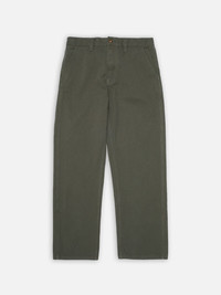 The Tuff Tony pants feature a loose fit, wide leg, and comfortable high waist, staying true to the essence of authentic workwear. Crafted from our "Duck Canvas," a pale fir-green 2-ply canvas weave, these pants are detailed with tonal stitching and copper "Donut" buttons. The result is a thoughtful piece, blending mid-20th-century vintage hunting gear inspiration with a workwear aesthetic. Details - Organic Cotton - 11 oz. rigid duck canvas - Matching thread at seams - Copper "Donut" buttons - Button fly - Four pockets - Woven patch - Loose fit - High waist - Wide leg - Wide leg opening 100% Cotton Made in TN The Tuff Tony pants feature a loose fit, wide leg, and comfortable high waist, staying true to the essence of authentic workwear. Crafted from our "Duck Canvas," a pale fir-green 2-ply canvas weave, these pants are detailed with tonal stitching and copper "Donut" buttons. The result is a thoughtful piece, blending mid-20th-century vintage hunting gear inspiration with a workwear aesthetic. Curious about the "Duck Canvas"? Let us explain. This fabric is meticulously constructed using irregular ring-spun yarns twisted into durable 2-ply threads, then yarn-dyed through a patented process to ensure it ages beautifully, much like its historical counterpart. The tightly woven dyed yarns create a firm, highly textural canvas that celebrates its imperfections, showcasing a unique crispness and depth. Perfectly suited for workwear, this robust fabric promises durability and a graceful aging journey, growing richer in character over time.