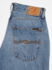 Wide-leg loose-fit jeans in a light blue wash with a worn, washed appearance. Crafted from ringspun denim with short slubs, subtle crosshatch, and marble textures. Made from organic cotton. Size & Fit Model is wearing size: W30" L32" Model's height: 186 cm / 6’1” Details - Organic Regenerative Cotton - 13.3 oz. rigid denim - Tobacco thread at seams - Stainless steel buttons - Copper rivets - Button fly - Jacron patch - Loose fit - High waist - Wide leg - Wide leg opening 100% Cotton Made in IT Wide-legged, loose-fit jeans in a light blue wash with an authentic worn and washed appearance. Crafted from a newfound favorite denim of ours, these jeans showcase a perfect balance of ringspun character. Short and defined slubs create subtle streakiness, while a slight crosshatch and muted marble textures add depth. The dense weave construction lends them a robust hand and a true vintage denim feel. These jeans are truly a work of art, balancing wash and denim craftsmanship for a characterful visual impression and a complex tactile experience.