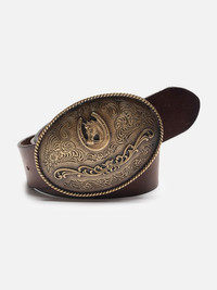 Classic western-style belt made from vegetable-tanned full-grain leather with ornamented buckle. Details - Vegetable-tanned full-grain leather - Width 38 mm - Ornamented buckle - Size is in centimeters and measured from the buckle pin to the middle hole. 100% Leather Made in PL A Western-style belt featuring a beautifully ornamented buckle. Crafted from 38 mm wide vegetable-tanned full-grain leather and a sturdy buckle, this belt showcases quality craftsmanship, intricate detail, and exceptional aging properties.