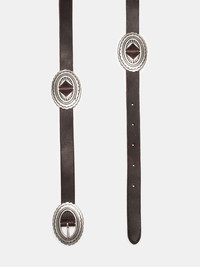 A Western-style belt crafted from 20 mm wide vegetable-tanned full-grain leather with an antique silver finish metal buckle and four matching conchas. Details - Vegetable-tanned full-grain leather - Width 20 mm - Antique silver finish metal conchas - Size is in centimetres and measured from the buckle pin to the middle hole. 100% Leather Made in PL A Western-style belt crafted from 20 mm wide vegetable-tanned full-grain leather with an antique silver finish metal buckle and four matching conchas. This belt showcases quality craftsmanship, intricate detail, and exceptional aging properties.