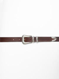Classic western-style belt made from vegetable-tanned full-grain leather. Details - Vegetable-tanned full-grain leather - Width 24 mm - Size is in centimeters and measured from the buckle pin to the middle hole. 100% Leather Made in PL Western-style belt with a classic dashed pattern on the loops, tip, and the edges of the buckle. We make all Nudie Jeans leather accessories from the finest vegetable-tanned full-grain leather.