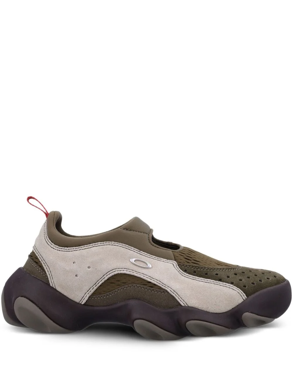 Flesh mesh-panelled slip-on sneakers Highlights - Olive green - Contrast suede panel - Perforated detailing - Padded ankle - Pull tab at heel Imported Composition Lining: Lycra 100% Outer: Polyester 83%, Leather 17% Sole: Rubber 50%, Polyethylene vinyl acetate (PEVA) 50%