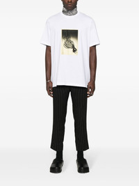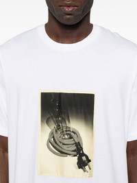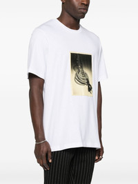 logo-print cotton T-shirt Highlights - White - Cotton - Jersey texture - Graphic print to the front - Logo print to the rear - Crew neck - Short sleeves - Straight hem Imported Composition Outer: Cotton 98%, Elastane 2% Cotton 100%, Silk 100% SIZE & FIT Model measurements Height 6 ft 0 in(1.84 m) Bust/Chest 35.82 in(91 cm) Hips 37 in(94 cm) Waist 28.34 in(72 cm) FittingInformation Designed for a relaxed fit, this piece allows for comfort and movement when worn Made from a midweight non-stretch fabric, this piece offers minimal elasticity when worn This piece fits true to size – take your usual size Washing instructions Hand Wash