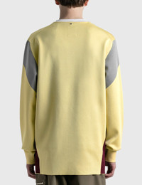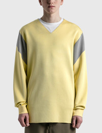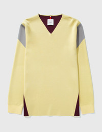 - OAMC - Primary V-neck Sweater - Relaxed fit - Knitted viscose exterior - Contrasting color panels - Ribbed back collar, cuffs - Color: Light Yellow - Material: 100% Viscose - See more Knitwear and Clothing SIZING - Model wears size M - Model measures: Height 183cm, Chest 36”/91cm, Waist 28”/70cm, Hip 36”/91cm