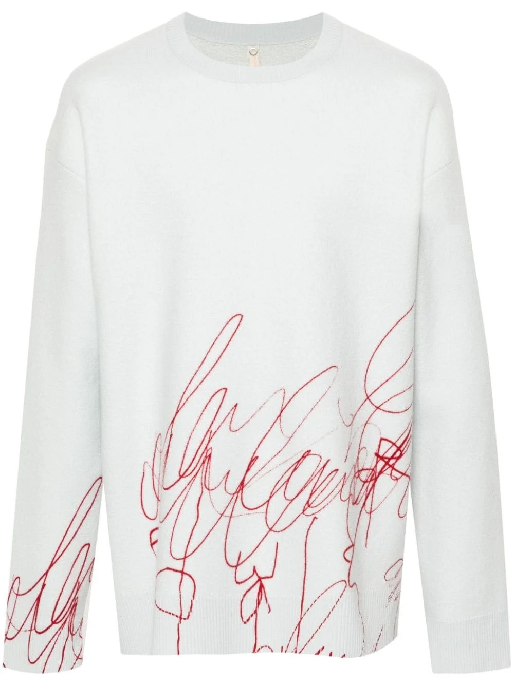 scribble-print fleece sweater Highlights - Light turquoise blue-green - Wool-cotton blend - Fleece texture - Scribble print to the front and rear - Crew neck - Drop shoulder - Long sleeves - Ribbed cuffs and hem - French terry lining Made in Italy Composition Wool 79%, Cotton 21% SIZE & FIT Model measurements Height 6 ft 2 in(1.87 m) Bust/Chest 37.79 in(96 cm) Hips 37.79 in(96 cm) Waist 30.31 in(77 cm) FittingInformation Designed for a relaxed fit, this piece allows for comfort and movement when worn Made with a midweight knit, this piece offers some stretch This piece fits true to size – take your usual size