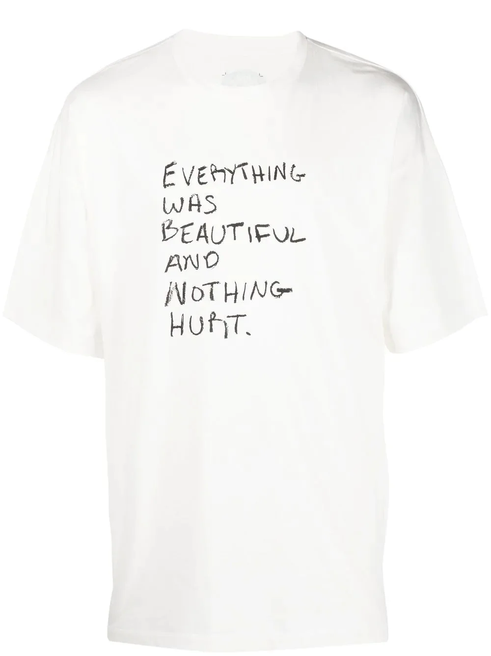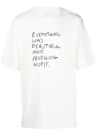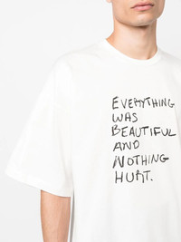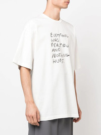 slogan-print cotton T-shirt white cotton slogan print to the front round neck short sleeves straight hem Imported Composition Cotton 100% SIZE & FIT Model measurements Height 6 ft 1 in(1.85 m) Bust/Chest 35.82 in(91 cm) Hips 37.79 in(96 cm) Waist 29.13 in(74 cm) FittingInformation This piece fits true to size. We recommend you get your regular size Cut for a loose fit Made with a mid-weight fabric Washing instructions Machine Wash