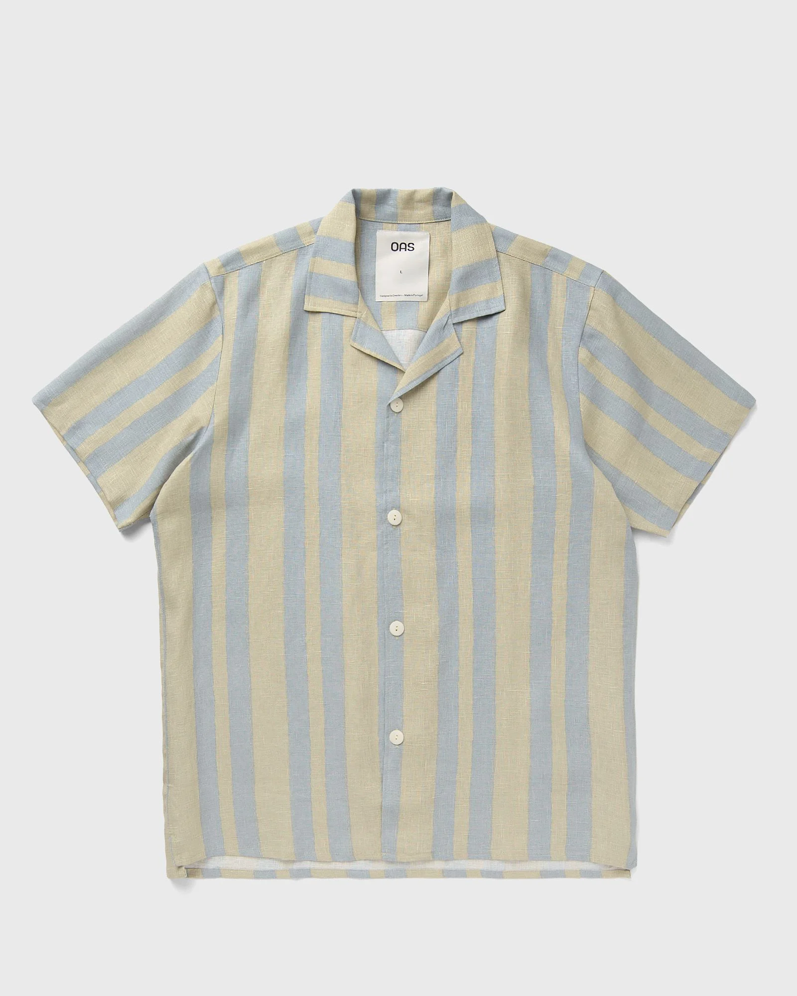 Tailored from breezy linen, the OAS Mist Strata Cuba Linen Shirt has a relaxed silhouette with boxy sleeves, a resort collar and buttons down the front. It is printed with a slightly faded stripe pattern. - Medium-weight woven linen - Button placket - Resort collar Article number: 7012-07 Gender: men Color: GREEN Material: 100% Linen