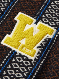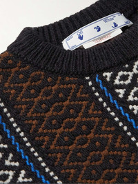 Off-White's sweater is made from soft wool-blend and designed with dropped shoulders to enhance the slouchy fit. Jacquard-woven with a geometric pattern, it's appliquéd with collegiate-inspired patches at the front. Size & Fit - Fits true to size - The model is wearing a size larger to achieve an oversized fit - This sweater is intended for a slightly loose fit - Mid-weight knit - Model wears a M - Model measures: chest 36"/ 92cm, height 6'0"/ 183cm Details & Care - Brown, white and blue wool-blend jacquard - 79% wool, 11% alpaca, 10% acrylic - Dry clean - Made in Italy