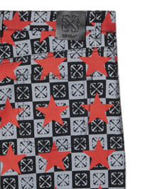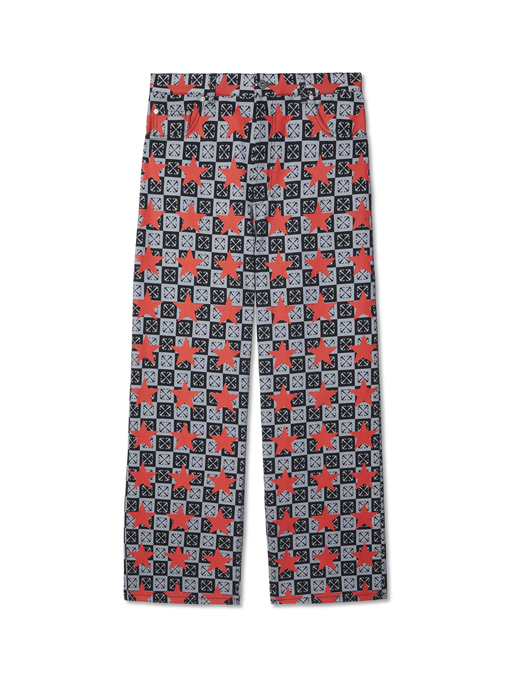 These 100% cotton denim jeans have a straight leg and feature an all-over checkerboard print made of arrow logos overlaid with stars Made in Italy. As seen in the Fall Winter 2024 Show entitled "Black by Popular Demand". MATERIALS Outer: 100% Cotton Lining: 35% Cotton Lining: 65% Polyester FITTING Bust 0cm Height 0cm Hips 0cm Waist 0cm