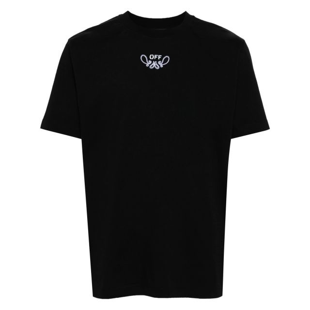 Product Code: OMAA027S24JER0011001 lightweight jersey ribbed trim signature Arrows motif embroidered bandana to the front and rear logo print to the front crew neck short sleeves straight hem Cotton 100% DETAILS Made in Italy Colour: black SIZE AND FIT The model is 1.86 m wearing size L