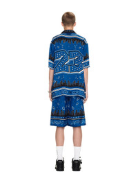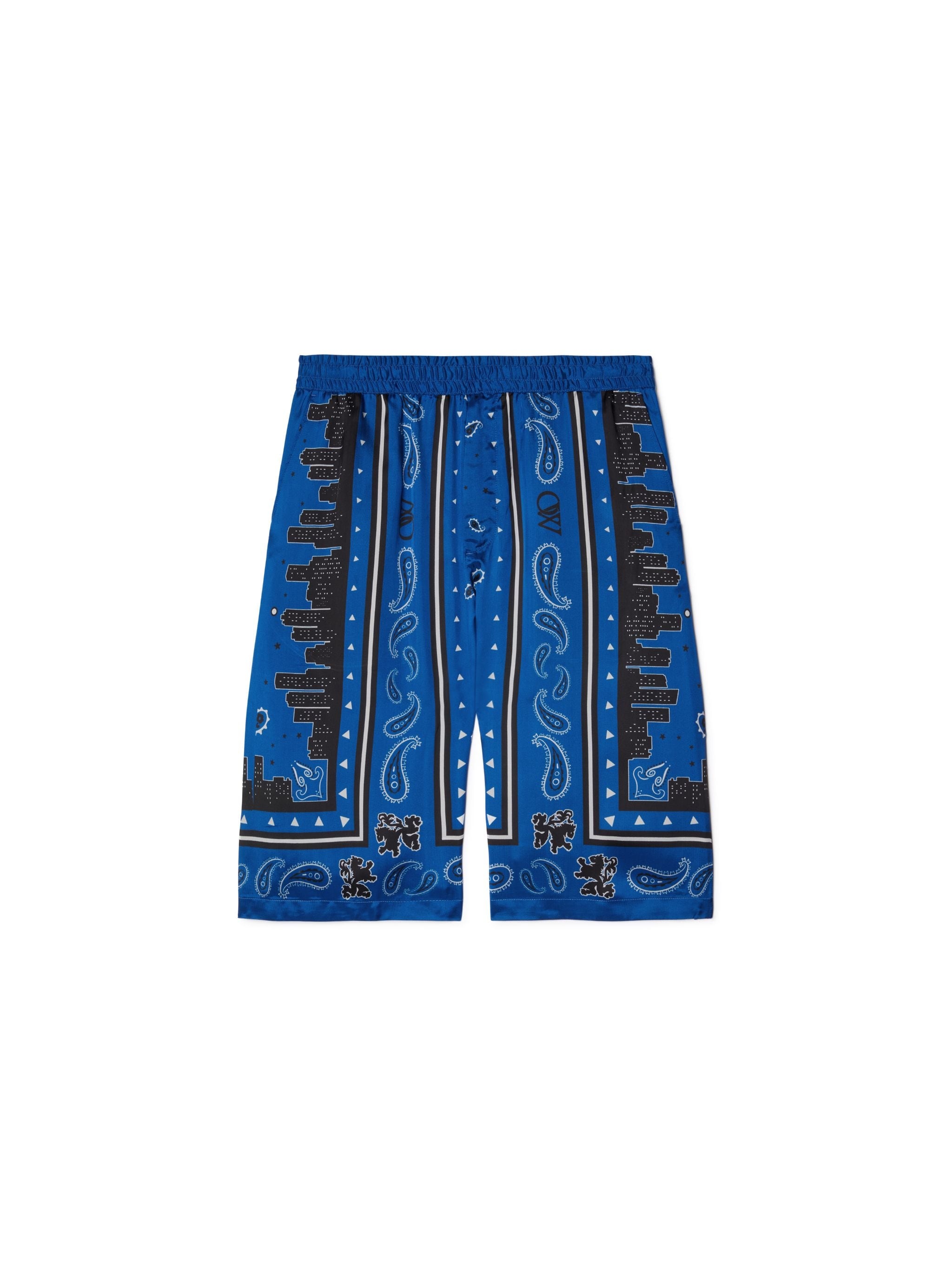 These relaxed fit Bermuda shorts feature a bordered bandana-style print with skyline illustrations and are crafted from silky viscose. Made in Italy. MATERIALS Lining: 52% Viscose Outer: 100% Viscose Lining: 48% Cupro FITTING Model Gabriel Noah wears size 48 Height 6' 1" (186 cm) Chest: 33" (85 cm) Hips: 35" (90 cm)