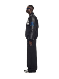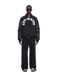 This varsity jacket features leather sleeves and a padded nylon chest for a vintage 90s feel. Popper buttons and a ribbed collar complete the look. Relaxed fit. MATERIALS Lining: 100% Cotton Outer: 100% Polyamide Lining: 48% Cupro Outer: 100% Leather Lining: 52% Viscose Outer: 100% Polyester Lining: 100% Polyester FITTING Bust 0cm Height 0cm Hips 0cm Waist 0cm