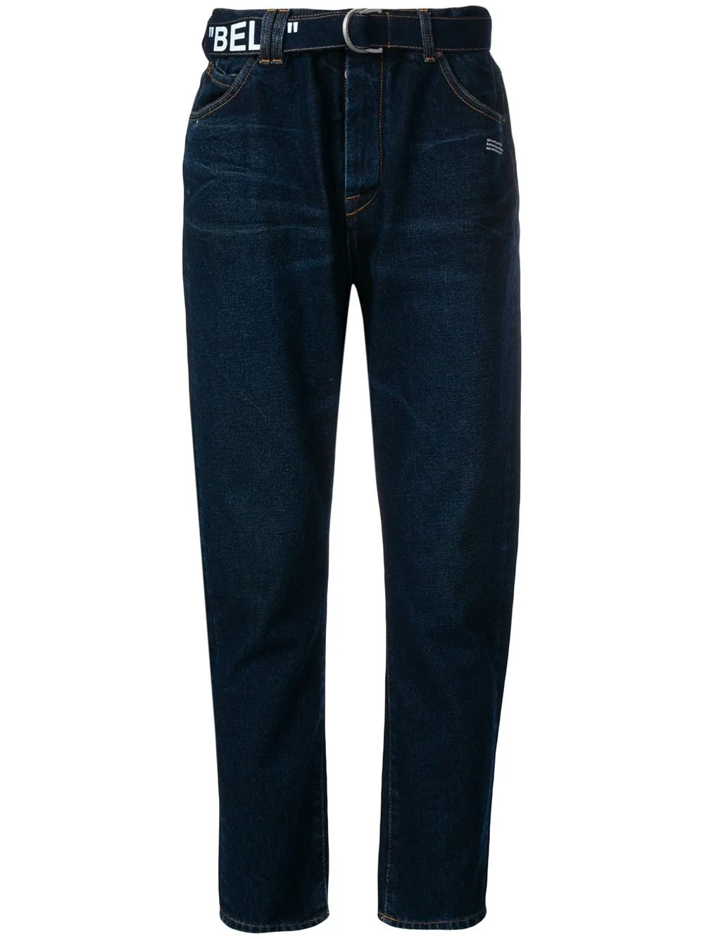 belted jeans Headquartered in Milan, the youth-driven label Off-White is committed to redefining the meaning of streetwear within high-fashion. These blue cotton belted jeans feature a button and zip fly, a five pocket design, a regular length and a tapered leg. Made in Italy Composition Lining: Cotton 100% Outer: Cotton 100% SIZE & FIT Model measurements Height 6 ft 2 in(1.87 m) Bust/Chest 37.79 in(96 cm) Hips 37.79 in(96 cm) Waist 30.31 in(77 cm) Washing instructions Machine Wash