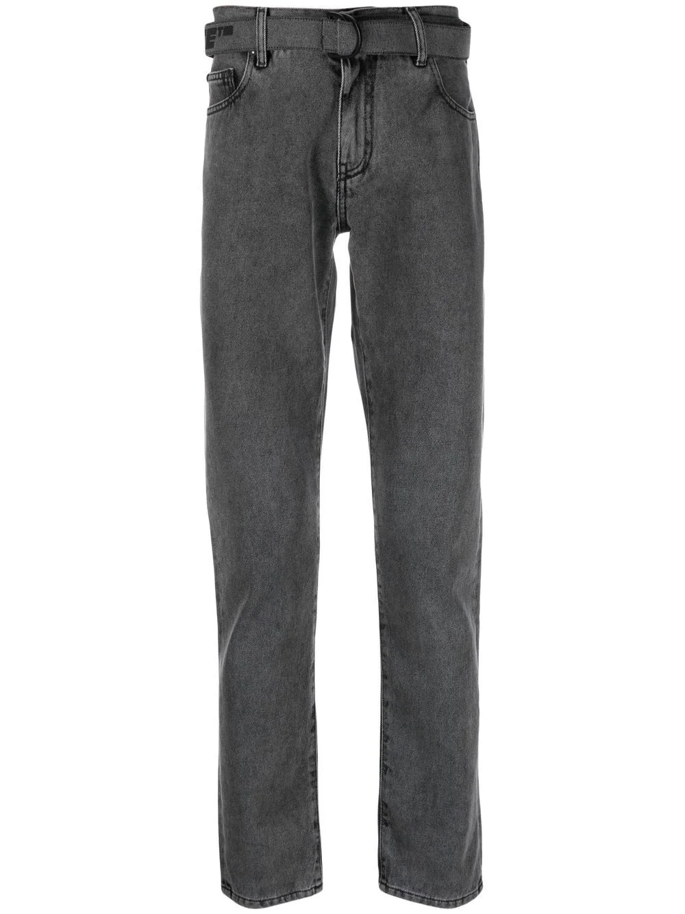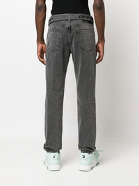 belted straight-leg jeans Boasting the logo print at the waistband, Off-White presents these jeans in a faded black wash for SS23. The belted waist elevates the classic straight-leg cut. Made in Italy Composition Outer: Cotton 100% Lining: Polyester 65%, Cotton 35% SIZE & FIT Model measurements Height 6 ft 0 in(1.84 m) Bust/Chest 36.22 in(92 cm) Hips 35.43 in(90 cm) Waist 26.77 in(68 cm) FittingInformation This piece fits true to size. We recommend you get your regular size Designed for a slim fit at the waist and loose over the leg Made with a mid-weight non-stretch fabric