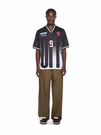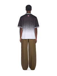 Explore the interplay of urban aesthetics and sports innovation with the Big Off Gradient Soccer Tee, crafted in lightweight fabric and marked by striking graphic elements. - V-neckline with contrasting trim - Short sleeves with striped cuffs - Bold gradient graphic on front and back - Signature crossed arrows motif at rear neckline - Lightweight, breathable construction - Urban-inspired oversized fit - Distinctive numerical and emblem detailing DETAILS - Embroidery: 100% Polyester, Material: 100% Polyester, Rib Details: 5% Elastane 95% Cotton - Code: OMAD00SF25JER0041001