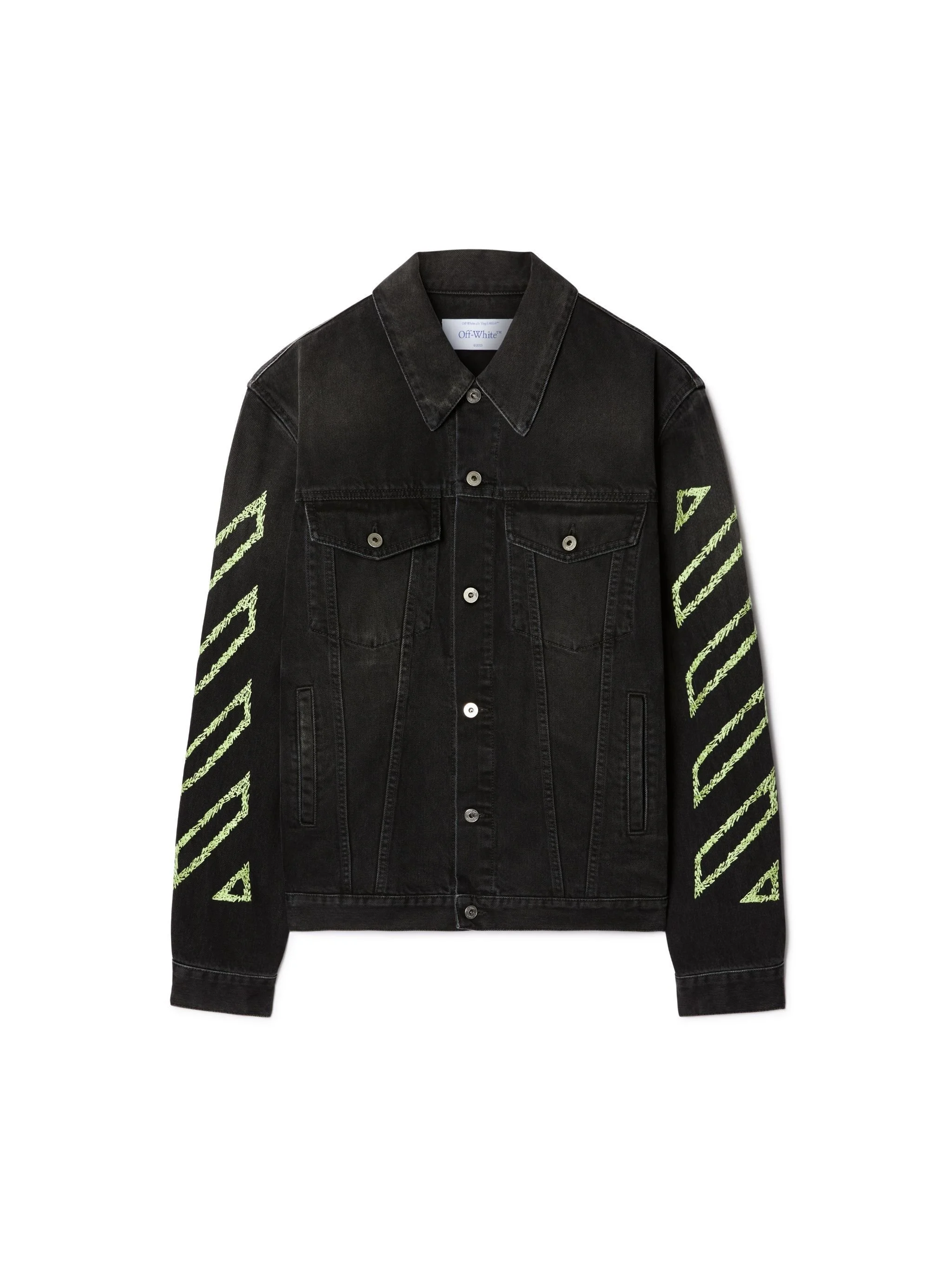 This 100% cotton denim jacket features large irregularly stitched diagonals on the sleeves and a matching arrow logo on the reverse. Made in Italy. DETAILS - NALLA WEARS SIZE M HEIGHT: 6' (184 CM) BUST: 35” (89 CM) WAIST: 27“ (70 CM) HIPS: 35” (89 CM) - Material:LINING:Cotton 35%, OUTER:Cotton 100%, LINING:Polyester 65% - Code: OMYE09BS25DEN0041350