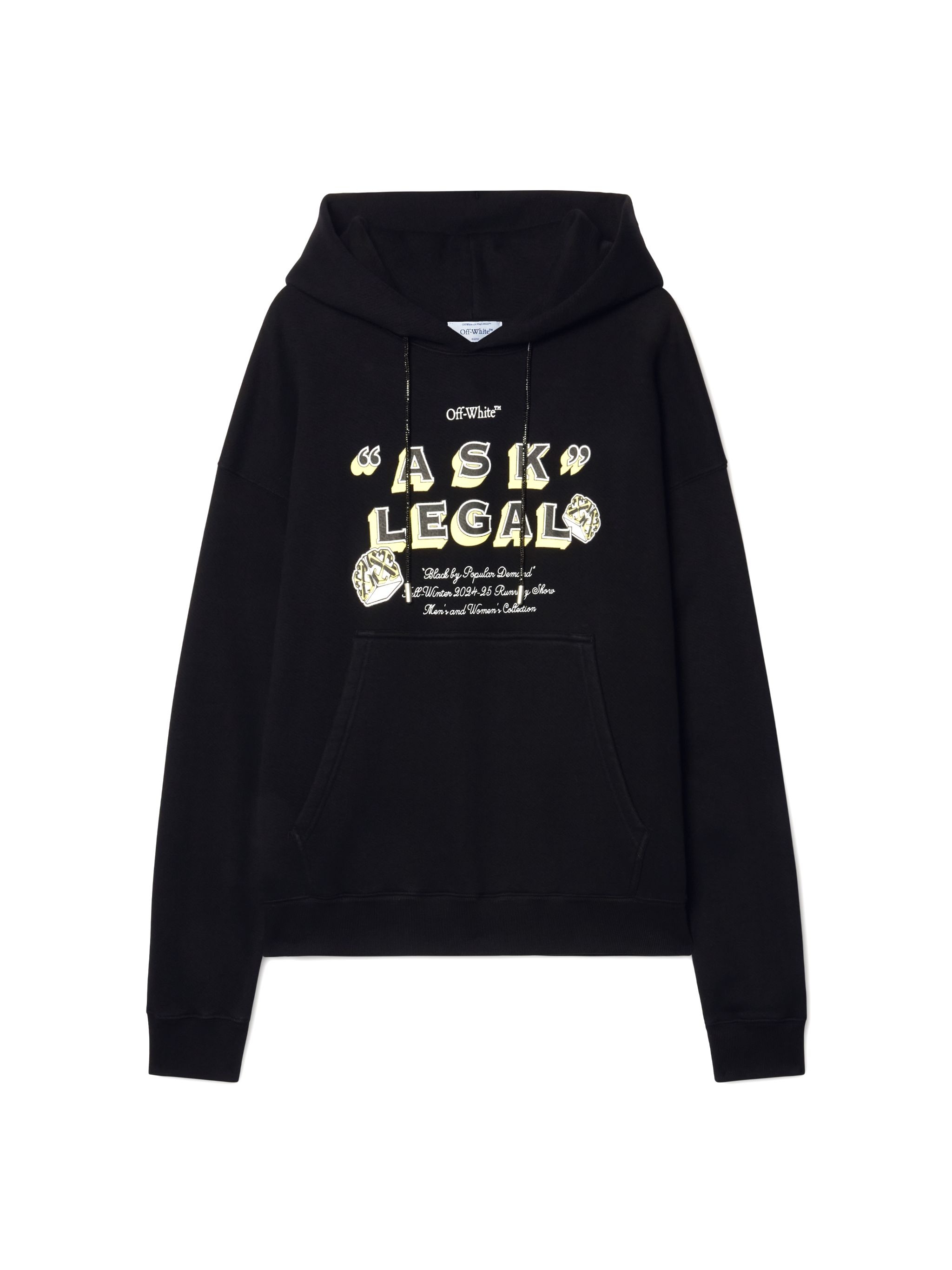 This skate fit hoodie features the "ASK LEGAL" message with dice on the front and an oversized arrow logo on the reverse. 100% cotton. As seen in the Fall Winter 2024 Show entitled "Black by Popular Demand. MATERIALS 100% Cotton FITTING MOMO WEARS SIZE M HEIGHT: 6' 1” (185 CM) BUST: 37” (94 CM) WAIST: 29” (74 CM) HIPS: 38” (96 CM)