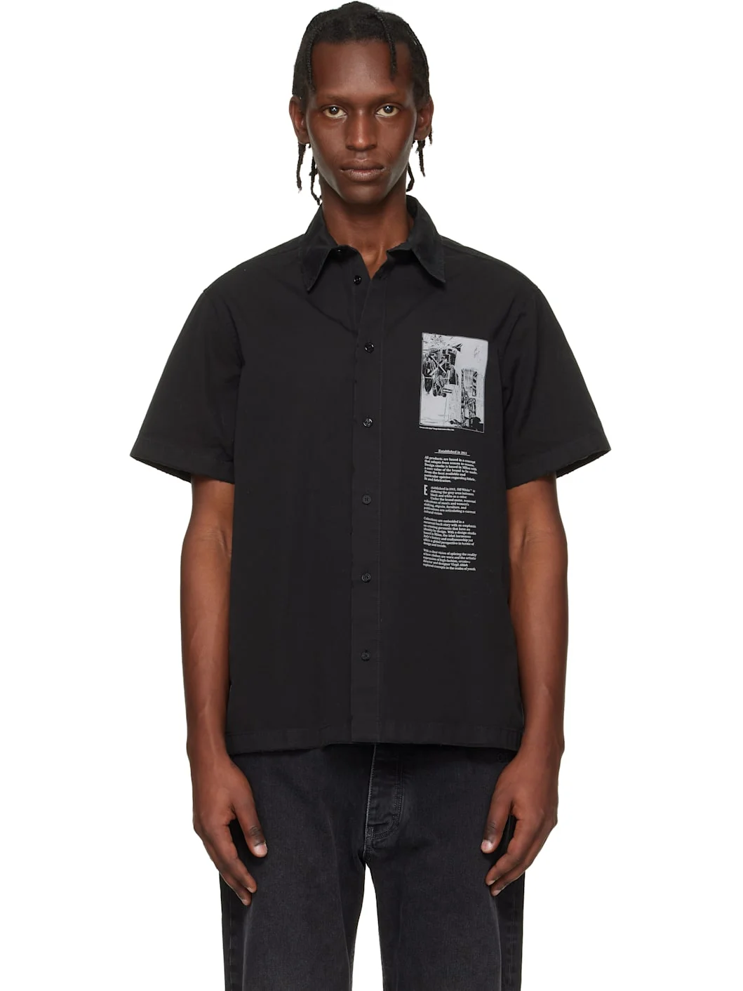 Cotton poplin shirt. · Spread collar · Button closure · Graphic and text printed at chest · Logo graphic printed at back Supplier color: Black/White 100% cotton. Made in Italy 252607M192003