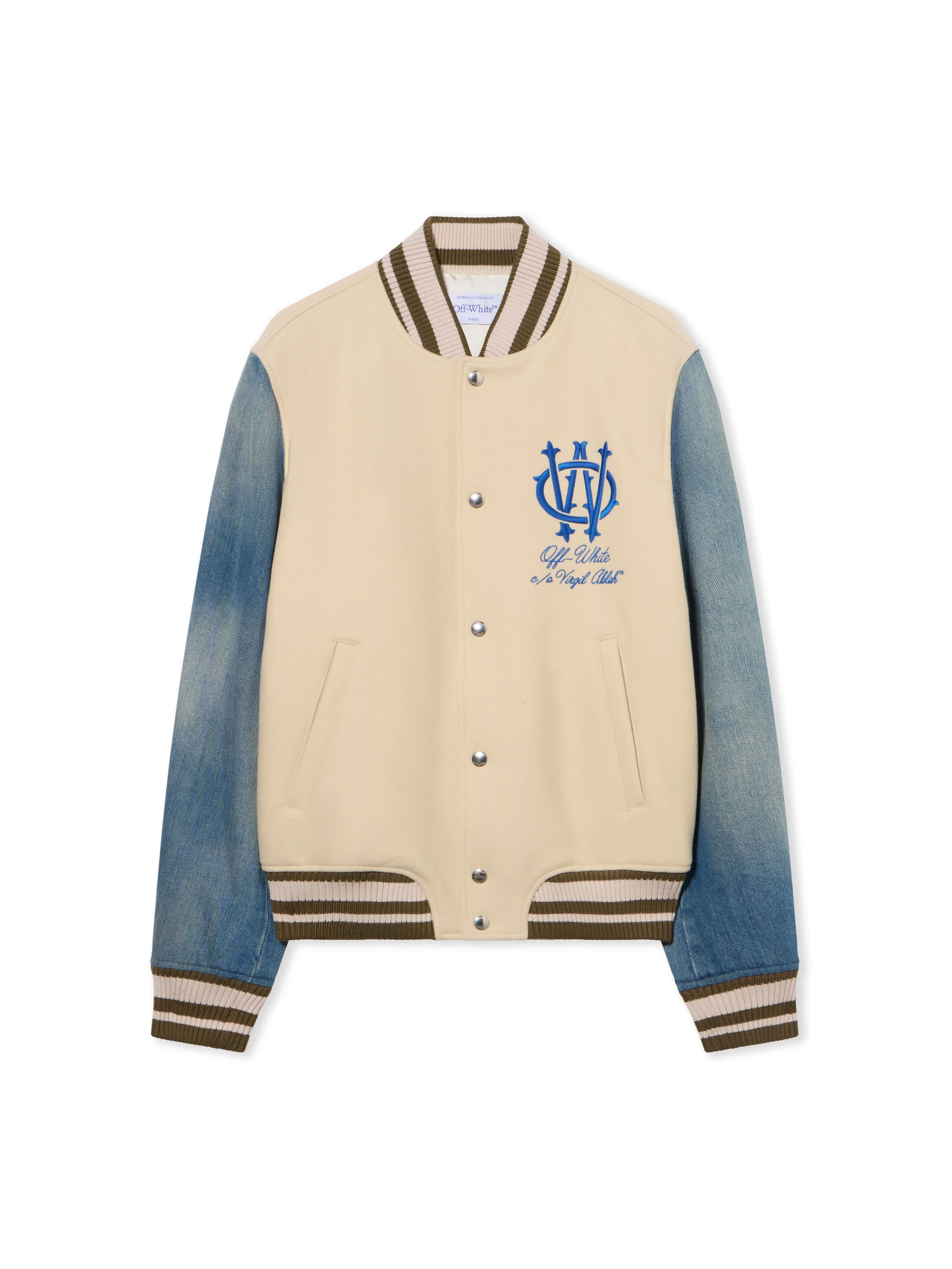 The Gothic Wool Denim Varsity Jacket exemplifies Off-White™'s signature urban aesthetic through its innovative blend of premium materials and distinctive branding. - Constructed from a wool body with denim sleeves - Features a ribbed collar and cuffs for a tailored fit - Front snap button closure enhances functionality - Embroidered Off-White™ branding on front and back - Contrasting fabric sleeves offer a unique visual texture - Interior lined for added comfort - Hem finished with ribbed detailing for structure - Made in Italy DETAILS - Body Lining: 100% Viscose, Material: 25% Polyamide (Nylon) 75% Virgin Wool, Rib Details: 10% Polyamide (Nylon) 2% Elastane 44% Acrylic 44% Wool, Sleeves Lining: 48% Cupro 52% Viscose - Code: OMEH053F25FAB0041746