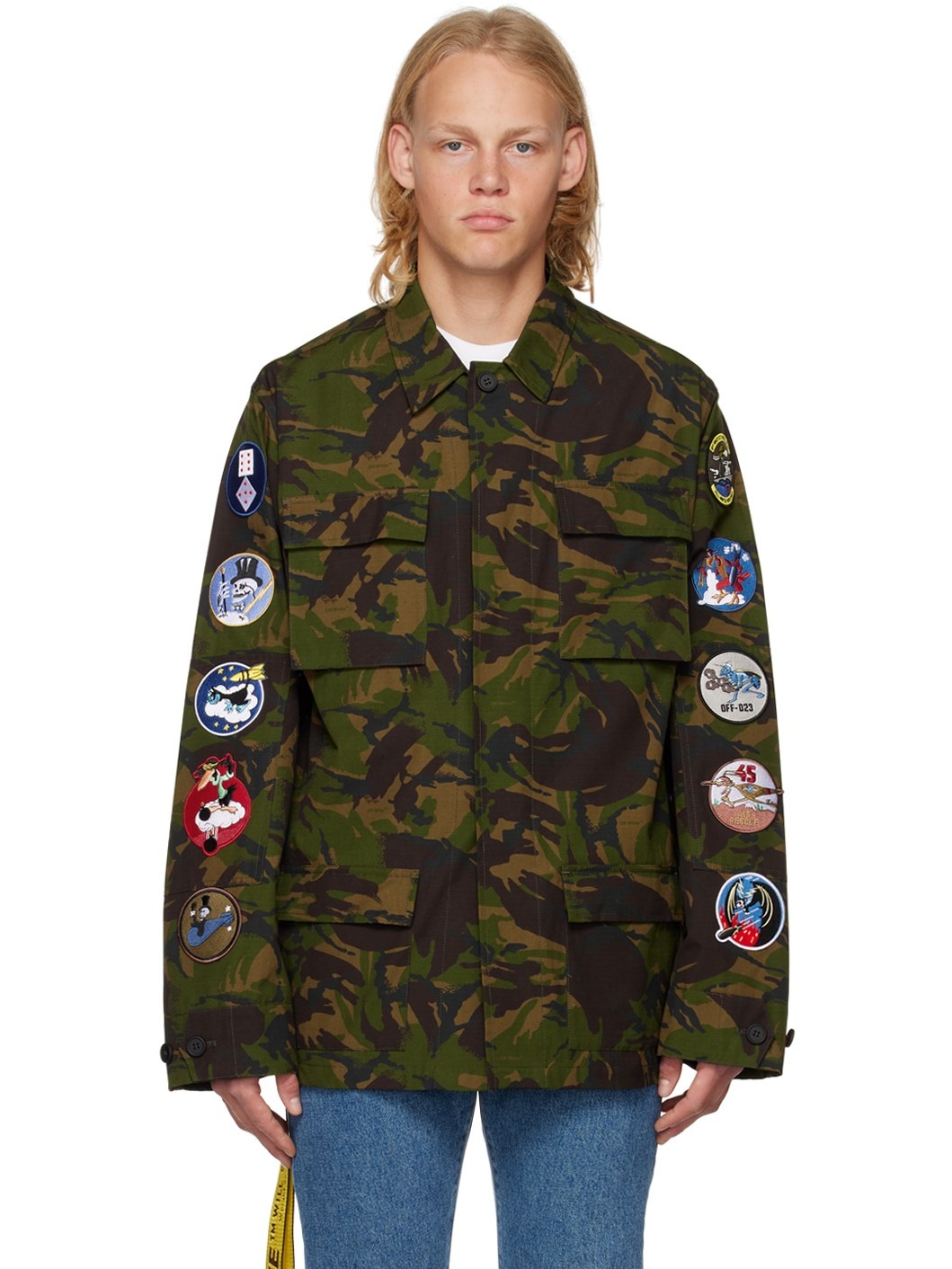 Cotton ripstop jacket. Camouflage pattern printed throughout. · Spread collar · Concealed button closure · Flap pockets at front · Textile graphic patches at sleeves · Adjustable button tab at cuffs · Logo printed at back Supplier color: Army green/White 100% cotton.