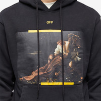 During his life, the late Virgil Abloh drew inspiration from a range of places including the classical art of Caravaggio - to the point the paintings have become a running motif in Off-White’s stylish collection’s. Here, it's Carravaggio’s ‘St. Francis of Assiss in Ecstasy’ that takes centre stage on this classic black hoody, with a bright yellow border adding a signature streetwear touch. It’s ideal for elevating your off-duty looks with an artistic touch. - 100% Cotton - Drawstring Hood - Printed Branding - Pouch Pocket - Ribbed Trims - Made in Portugal