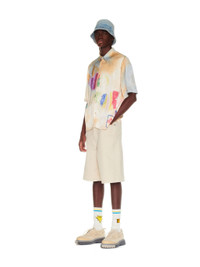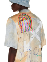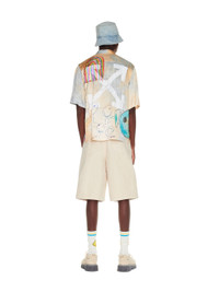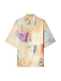 Beige short sleeves shirt with multicolor cartoon details at front. White arrows at back. Spread collar. MATERIALS 100% Viscose FITTING Model Abdou Diop wears size M Height: 6' 3" (191 cm) Chest: 35" (89 cm) Waist: 30" (78 cm)