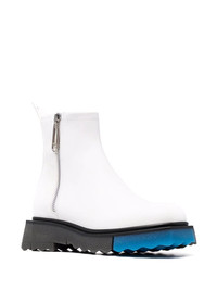 contrast panel ankle boots Speaking to Off-White's idea of 'embracing the now in a sophisticated manner', these boots pair a classic ankle-length silhouette with an unexpected sponge sole. The paperclip motif - a signature Off-White theme - offers further modern detailing. Made in Italy Composition Back: Rubber 100% Lining: Leather 100% Outer: Leather 100% SIZE & FIT Measurement CIRCUMFERENCE 9.44 in(24 cm) HEEL 1.96 in(5 cm) HEIGHT 6.29 in(16 cm) Sole height 1.18 in(3 cm)