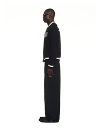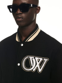 Black varsity featuring white Off-White patches at front. Black leather sleeves with multicolors lunar patches. Spread collar. Buttons as closure. White script patches at back. MATERIALS Outer: 25% Polyamide Lining: 100% Viscose Outer: 75% Virgin Wool FITTING Model Alexandre Sewa wears size M Height: 5' 11" (182 cm) Chest: 32" (81 cm) Waist: 26" (68 cm)