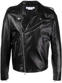 Diag-print biker jacket A signature Diag-stripe print takes the focus of this leather biker jacket from the streetwear brand, Off-White. The design appears in black colour and features two zip fastening pockets for more storage. Imported Composition Outer: Leather 100% Lining: Cotton 100%, Viscose 52%, Cupro 48% Washing instructions Specialist Cleaning