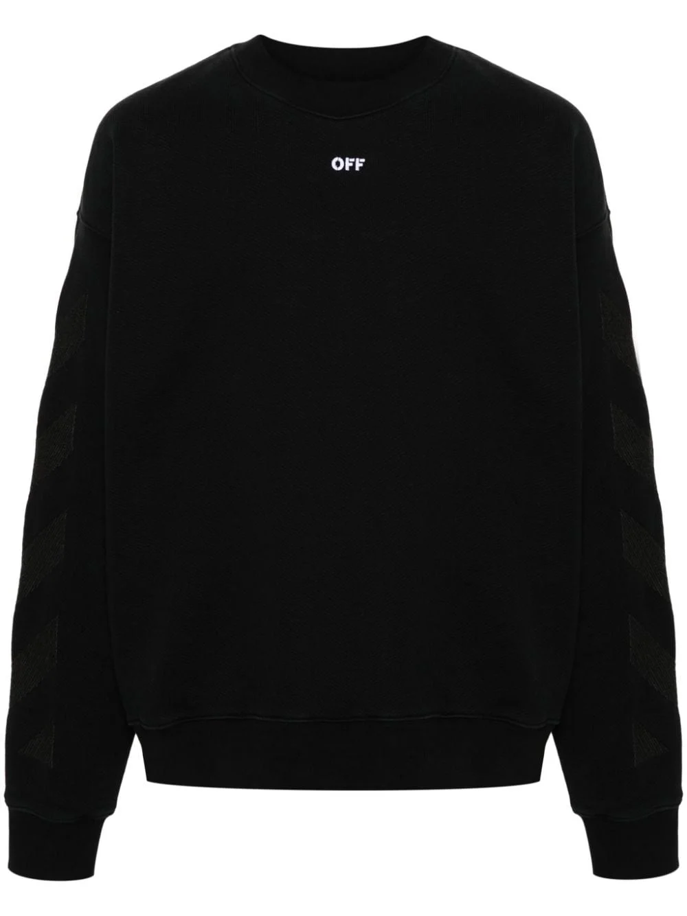 Diag-stripe cotton sweatshirt Off-White’s sweatshirt is instantly recognisable thanks to the branded elements: note the printed OFF logo at the front and subtle Diag Stripe at the sleeves. The design is cut from black cotton jersey to a classic crew-neck silhouette. Highlights - Black/white - Cotton - Jersey texture - Embroidered logo to the front - Signature diag-stripe pattern to the sleeves - Crew neck - Drop shoulder - Long sleeves - Ribbed cuffs and hem - Short side slits - Straight hem - French terry lining - Authenticity qr code Made in Italy Composition Cotton 100% SIZE & FIT Model measurements Height 6 ft 2 in(1.87 m) Bust/Chest 36.22 in(92 cm) Hips 37 in(94 cm) Waist 27.95 in(71 cm) FittingInformation Designed to be unstructured, offering a loose fit throughout Made from a midweight non-stretch fabric, this piece offers minimal elasticity when worn This piece fits true to size – take your usual size Washing instructions Machine Wash