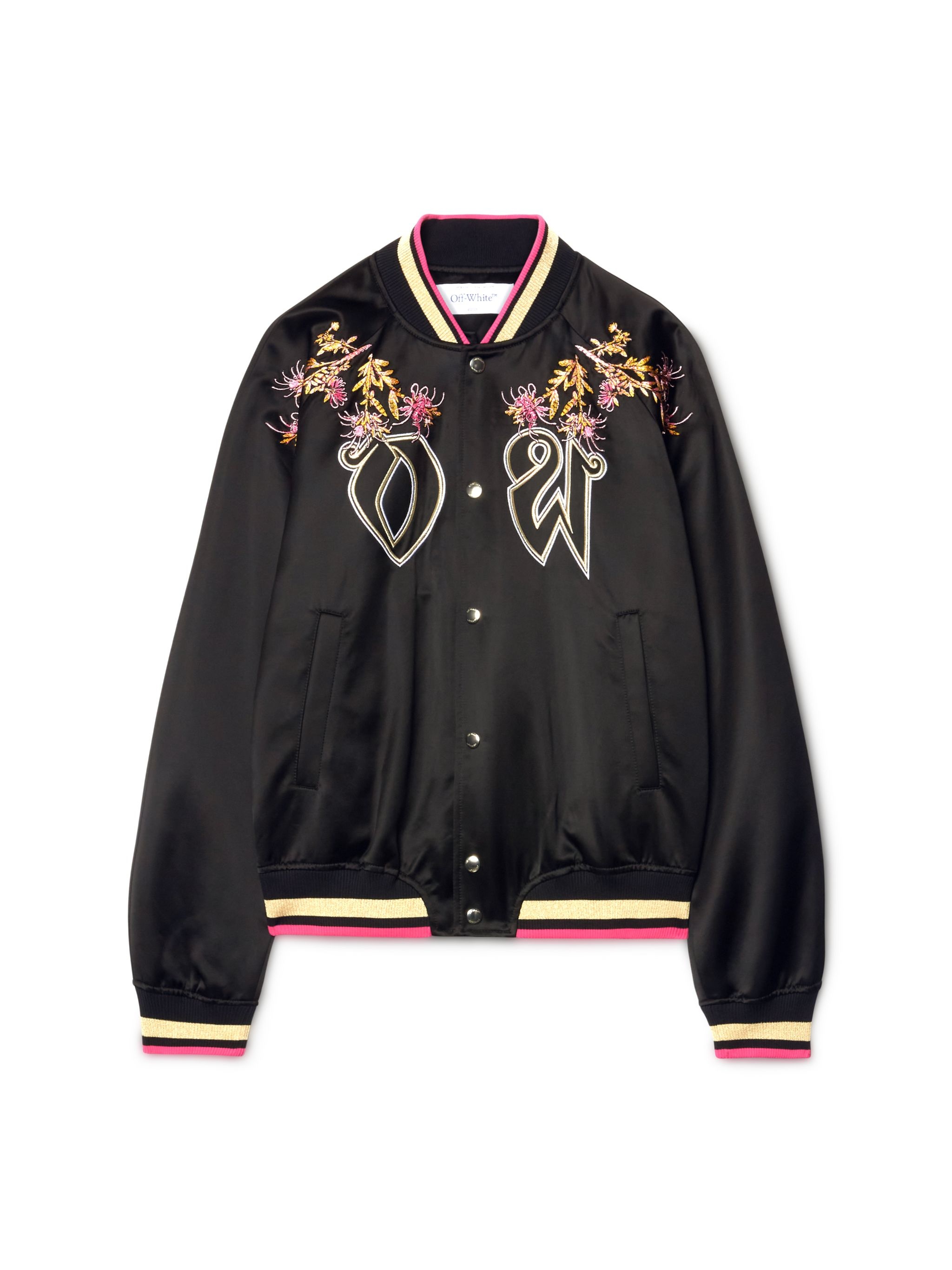 black satin finish front press-stud fastening baseball collar embroidered egle motif ribbed striped edge two front welt pockets long sleeves ribbed cuffs and hem logo-jacquard lining multiple internal slip pockets MATERIALS Lining: 100% Viscose Outer: 100% Viscose FITTING Bust 0cm Height 0cm Hips 0cm Waist 0cm