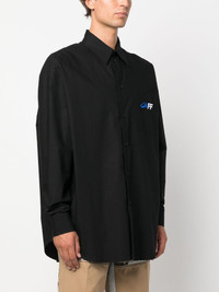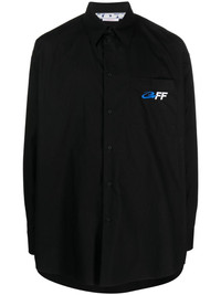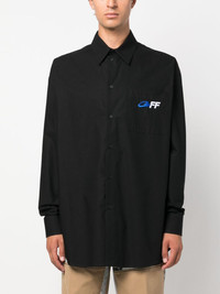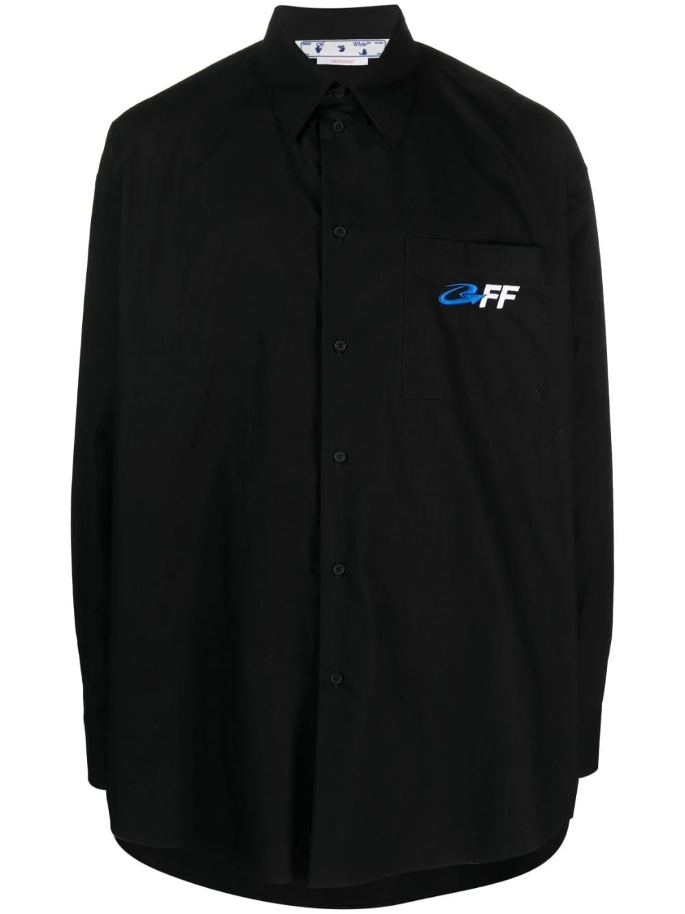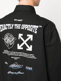 Exact Opp-print long-sleeve shirt An ode to Off-White's spirit and ethos, this shirt is adorned with some of the brand's most common symbols and motifs, including a small description of its conceptual roots. The top gets its moniker from the slogan embroidery at the back - 'Exactly the Opposite' - which is the name of the SS23 collection. Highlights - Black - Cotton - Embroidered logo at the chest - Logo print to the rear - Pointed flat collar - Long sleeves - Buttoned cuffs - Front button fastening - Chest patch pocket - Curved hem Made in Italy Composition Cotton 100%, Polyester 100% SIZE & FIT Model measurements Height 6 ft 1 in(1.85 m) Bust/Chest 35.43 in(90 cm) Hips 35.82 in(91 cm) Waist 27.55 in(70 cm) FittingInformation Designed to be unstructured, offering a loose fit throughout Made from a midweight non-stretch fabric This piece fits true to size – take your usual size Washing instructions Hand Wash